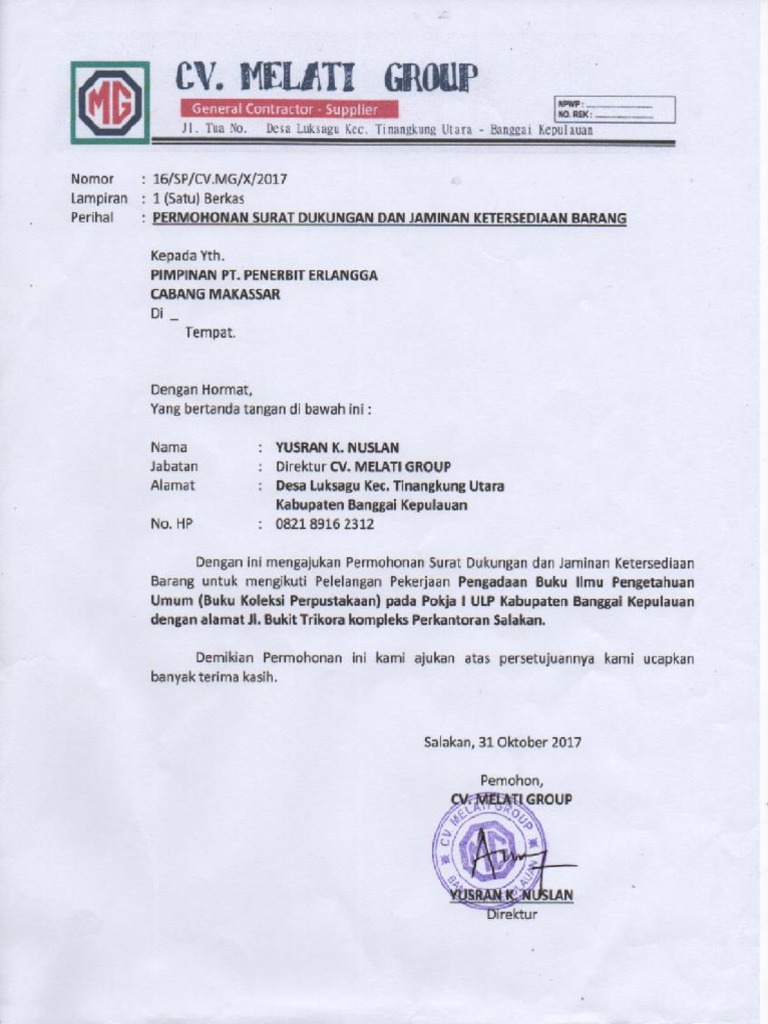 Permohonan Surat Dukungan Dan Jaminan Ketersediaan Barang Cv Melati Group